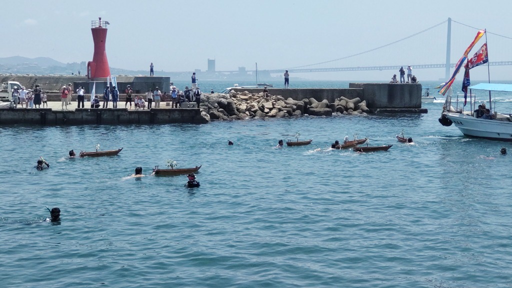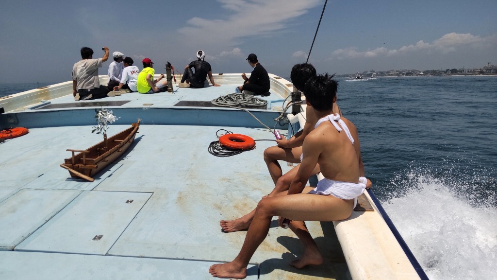 本来はこのおしゃたか舟と青年たちが言い伝えの場所まで泳いでたんやと思うけど、現代は沖へ出たところで青年らをエンジン付きの船に引き上げ彼らを乗せて海を渡ります🌊