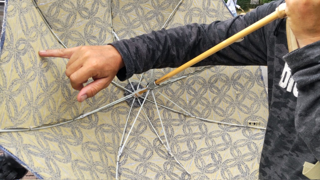 専務に職人手作りの私の日傘を見せたら傘自体の作りもさることながら生地に関心を示し「何これ」「どういうこと?」「ええーっ」「これは…」と10分近く唸っておりました😊⤴️