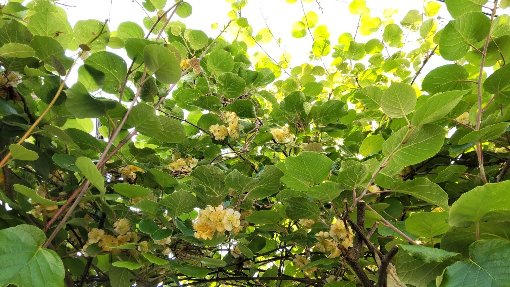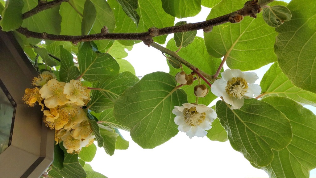 ご近所のキウイが雄花雌花どちらも咲いて葉も繁り賑やか🥝✨